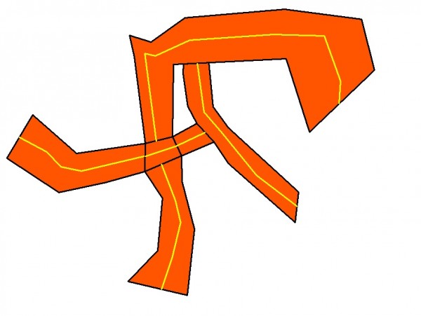 Adjunto imagen de ejemplo con los resultados que quiero obtener. El polígono naranja sería la superficie de la carretera y la línea amarilla sería el eje de la calle: